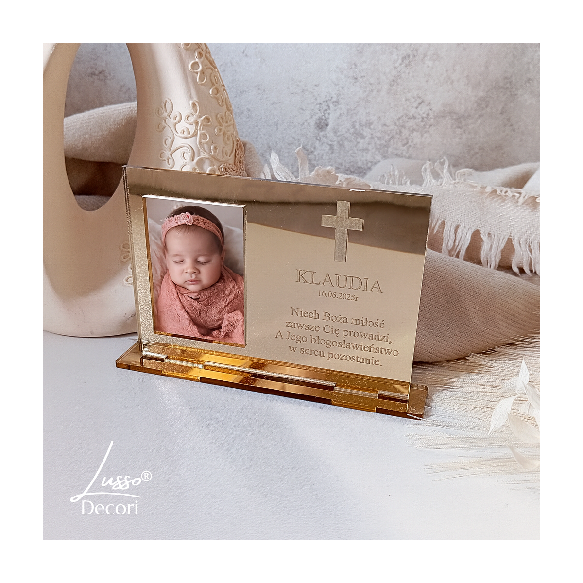 Elegancka statuetka z lustrzaną ramą i grawerowanym wizerunkiem różańca z Matką Boską. Wykonana z przezroczystej plexi, zawiera możliwość personalizacji imieniem i datą uroczystości, co czyni ją wyjątkową pamiątką sakralną od dziecka dla Rodziców Chrzestnych czy dziadków.