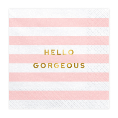 Dodaj odrobinę uroku swojej uroczystości dzięki serwetkom papierowym Yummy. Białe z jasnoróżowymi paskami oraz złotym napisem "Hello Gorgeous" będą idealnym dodatkiem do dekoracji stołu na Baby Shower, urodziny czy roczek dziewczynki.