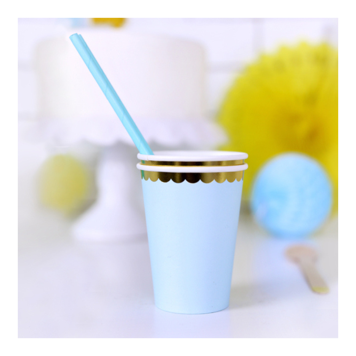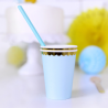 Papierowe kubeczki w kolorze jasnoniebieskim to idealna dekoracja stołu na wiele okazji, w tym baby shower i urodziny.