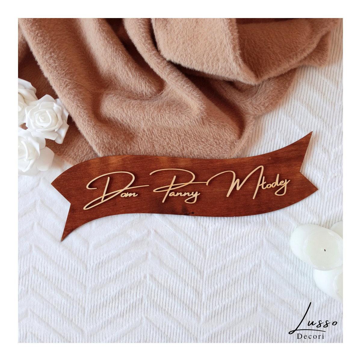 Drewniana tabliczka w kształcie wstęgi z napisem "Dom Panny Młodej" to doskonały dodatek do dekoracji weselnej, szczególnie w stylu boho lub rustykalnym.