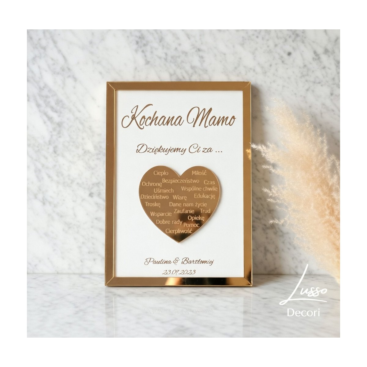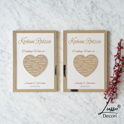 - ramka, oraz serce wykonane z lustrzanej plexi w kolorze złotym lub srebrnym do wyboru