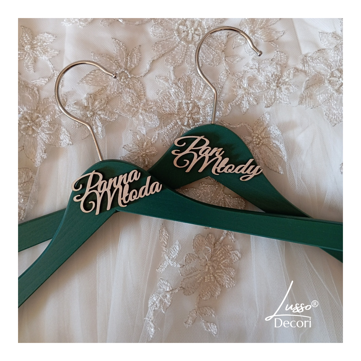 Wieszaki ślubne w kolorze butelkowej zieleni z drewnianym złotym napisem "Pan młody, Panna młoda". Idealne do ozdobienia sukni i garnituru podczas ceremonii zaślubin. Modny i elegancki design dodaje blasku i uwiecznia wyjątkowe przygotowania ślubne.
