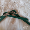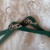 Wieszaki ślubne w butelkowej zieleni z ozdobnym złotym napisem "Mąż" i "Żona" z aplikacją serduszka to elegancki i modny dodatek do wyeksponowania sukni i garnituru na weselu.