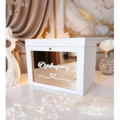 Drewniane pudełko na koperty z lustrzanym frontem to propozycja dla Par Młodych, które marzą o eleganckiej i efektownej dekoracji ślubnej. Złote lustro pięknie odbija światło, nadając całości wyjątkowego blasku i prestiżowego charakteru.