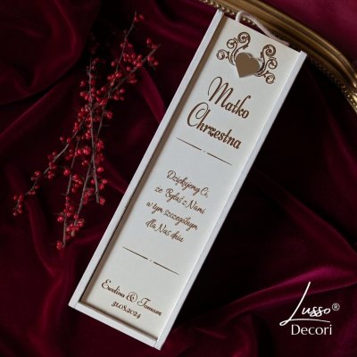 Podziękowanie dla matki chrzestnej w formie skrzynki na wino to prezent, który robi wrażenie już od pierwszego spojrzenia. Lustrzany dekor nadaje całej skrzynce luksusowego charakteru, a jednocześnie podkreśla wagę gestu, dzięki czemu prezent nabiera wyjątkowego znaczenia.