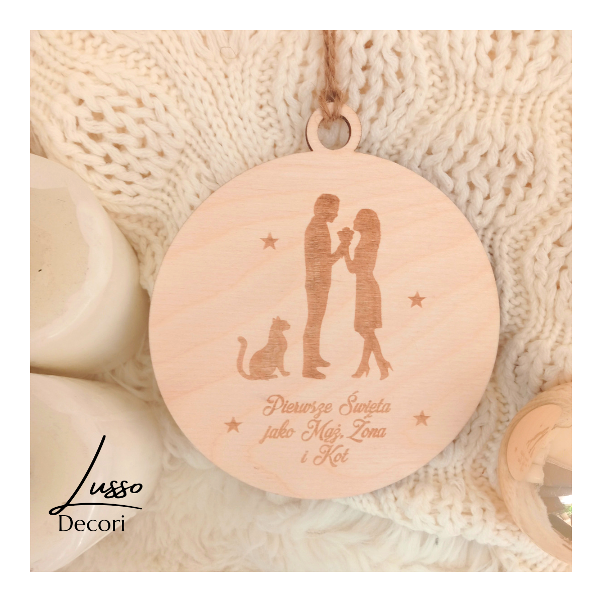 Zawieszka dla Nowożeńców z wygrawerowanym kotem - Idealna ozdoba na pierwsze Święta Małżeńskie! Ta urocza bombka na choinkę jest doskonała zarówno dla młodej pary jako mąż i żona, jak i dla miłośników kotów.